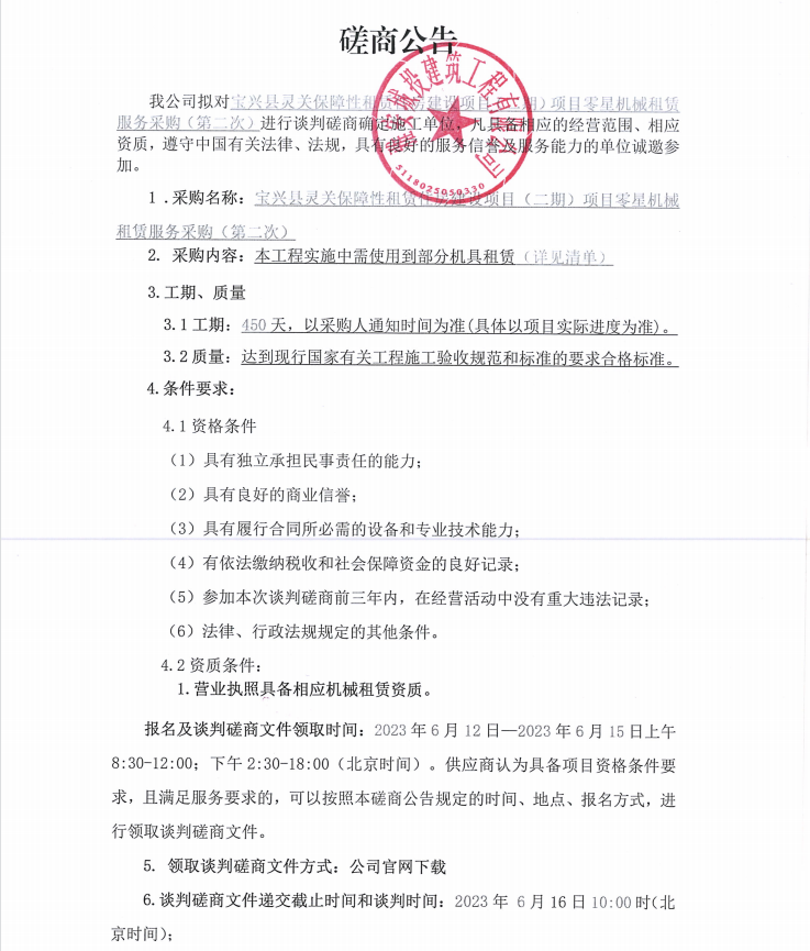 寶興縣靈關(guān)保障性租賃住房建設(shè)項(xiàng)目(二期)項(xiàng)目零星機(jī)械租賃服務(wù)采購(gòu)(第二次)談判磋商公告