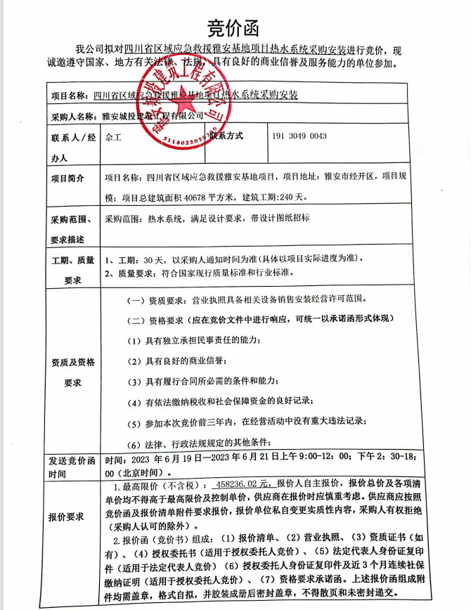 四川省區(qū)域應(yīng)急救援雅安基地項(xiàng)目熱水系統(tǒng)采購安裝競價公告