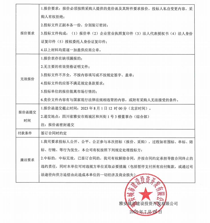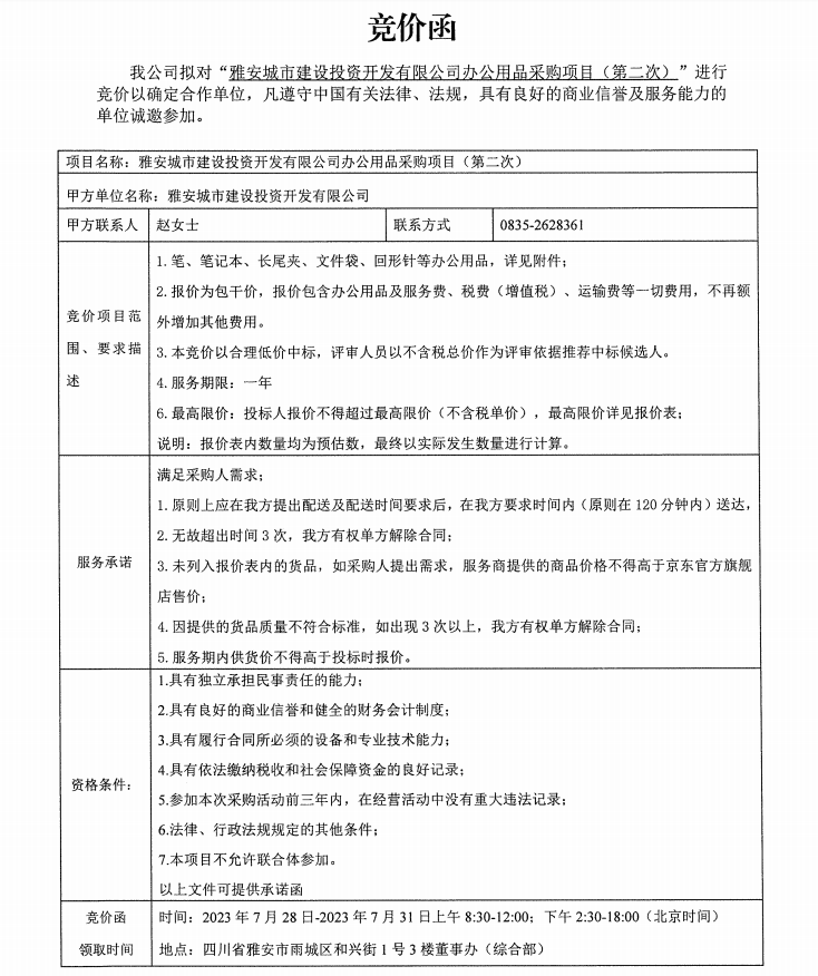 雅安城市建設(shè)投資開發(fā)有限公司辦公用品采購項(xiàng)目(第二次)競價公告