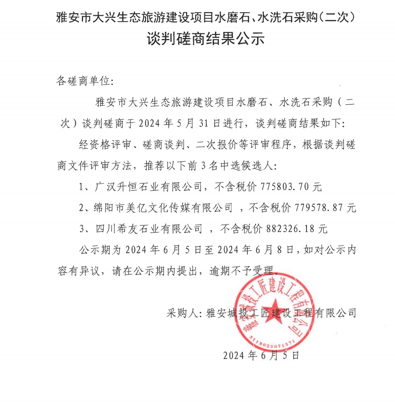 雅安市大興生態(tài)旅游建設項目水磨石、水洗石采購(二次)談判磋商結果公示