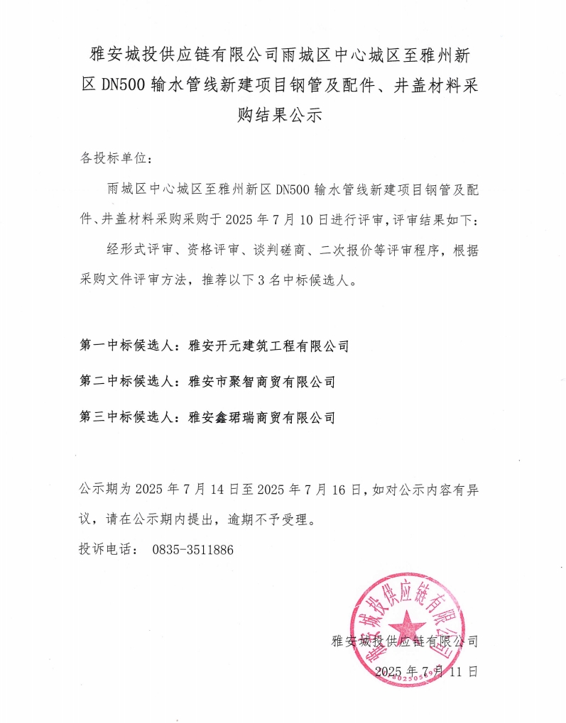 雅安城投供應(yīng)鏈有限公司雨城區(qū)中心城區(qū)至雅州新區(qū)DN500輸水管線新建項(xiàng)目鋼管及配件、井蓋材料采購結(jié)果公示