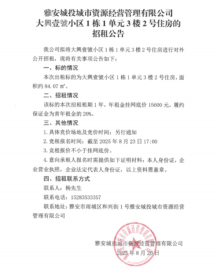 雅安城投城市資源經(jīng)營管理有限公司大興壹號小區(qū)1棟1單元3樓2號住房的招租公告