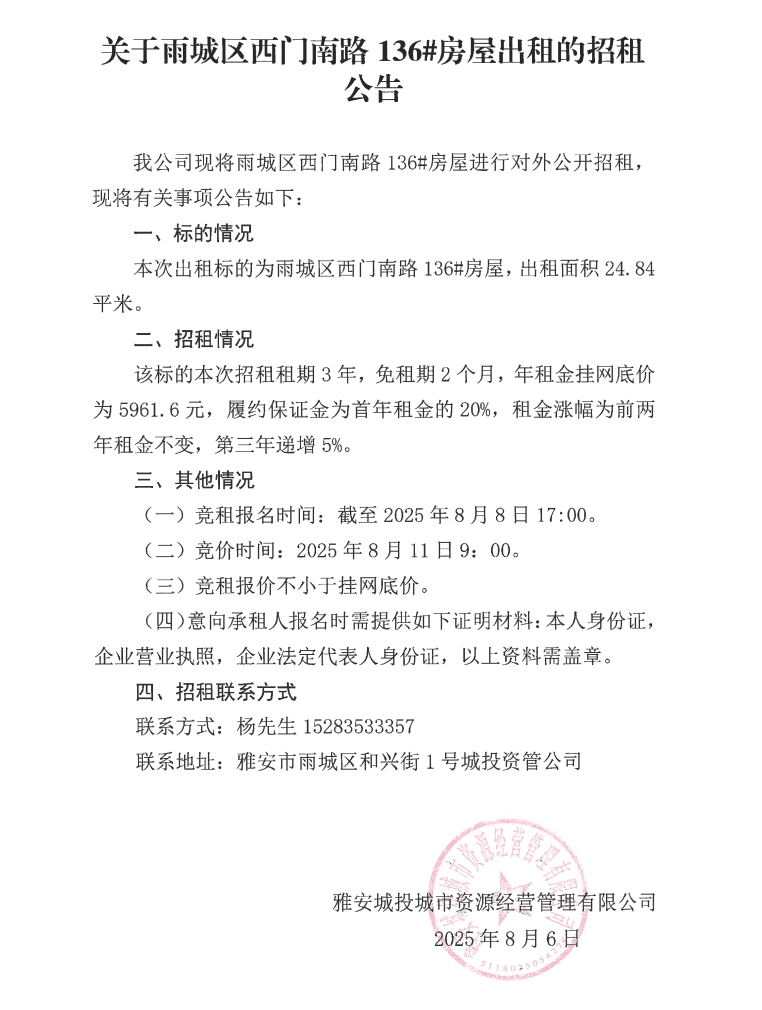 關于雨城區(qū)西門南路136#房屋出租的招租公告